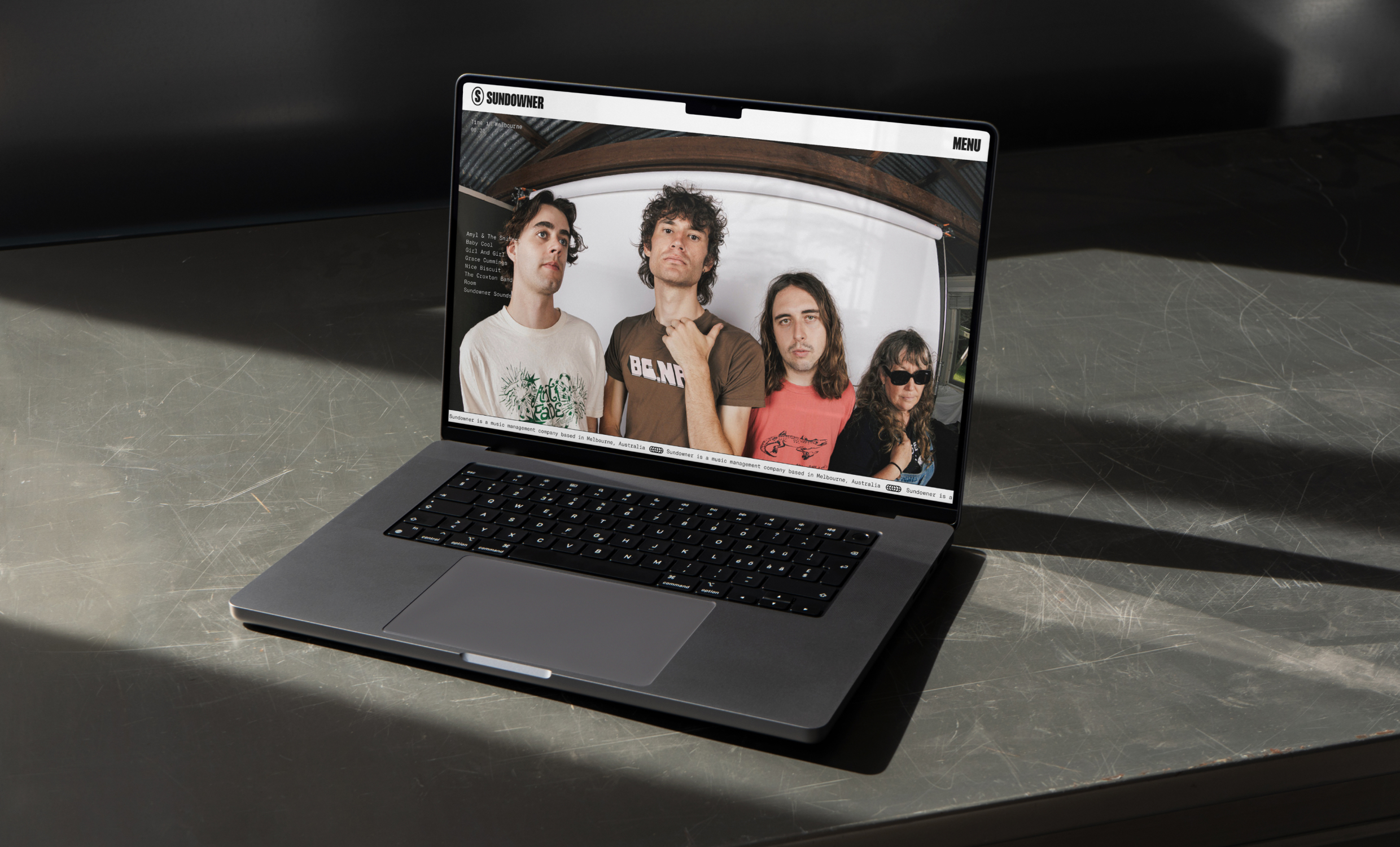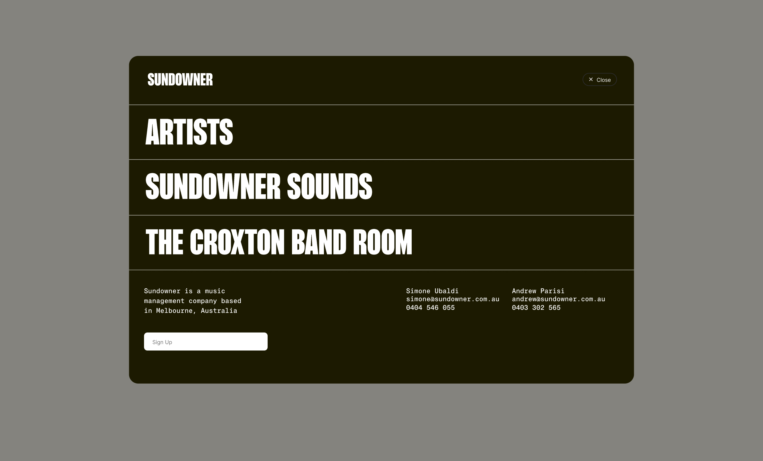 The brand system extended across a new website, marketing materials, and artist-specific assets, ensuring Sundowner's identity felt cohesive whether seen on a desktop, a social post, or a printed artist card. The typography does a lot of the heavy lifting, the condensed sans-serif used in the logo and repeated as a graphic device creates a strong, recognisable visual anchor that scales across every application.